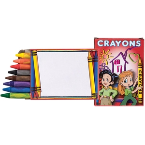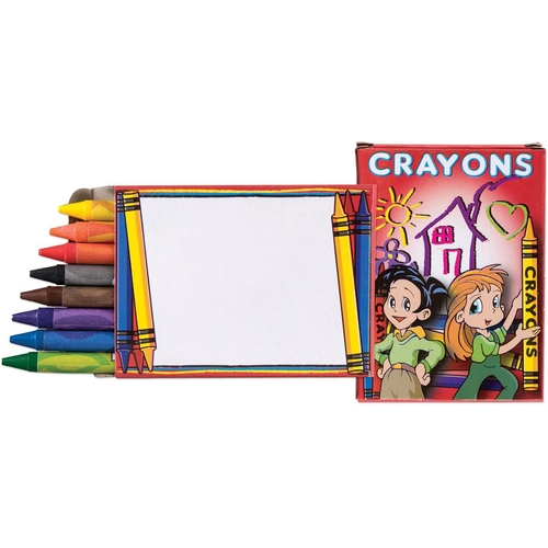 Increase your name recognition with this fun-filled promotional product! Our 8 pack of wax crayons includes a red, blue, yellow, purple, black, orange, brown and green stick. Crayons bring out the creative side in everyone and encourage children to express themselves. Non-toxic, so parents can rest easy. Conforms to ASTM D4236. This child friendly promotional item would be great for schools, restaurants and hospitals. Fun for kids of all ages.