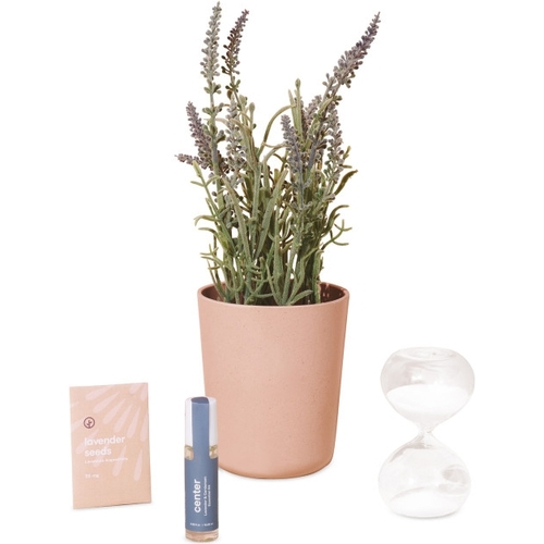 - Includes: Lavender Grow Kit, non-GMO Lavender Seeds, Meditation Hourglass, Soothing Essential Oil Roller.