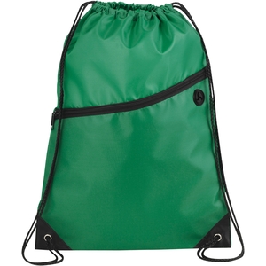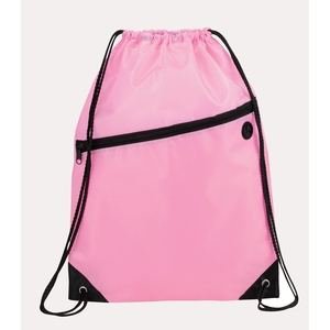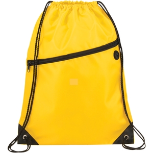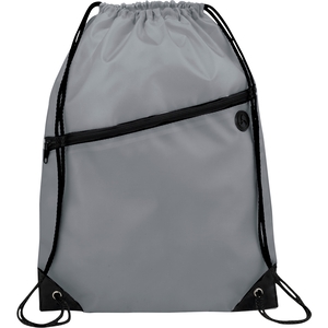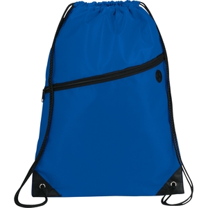 The Robin Drawstring Bag has a large main compartment with a cinching rope closure. The zippered front pocket also features an earbud port and reinforced corner tabs.