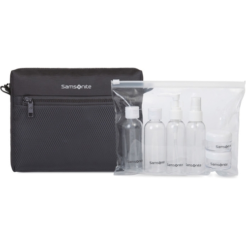 Your go-to travel companion for keeping your toiletries organized while on the go, The Samsonite Zippered Pouch and 6 Piece Travel Bottle Set reduces the need to buy toiletries for every trip, Refill the reusable bottles with your favorite products from home, Travel bottle set includes: 4 plastic bottles with squeeze, spray, pump and pour tops for packing and organizing shampoo, or lotions, 2 tubs for storing creams, waxes, or vitamins, Plastic bottles are 3 Oz. in size, making them checkpoint friendly