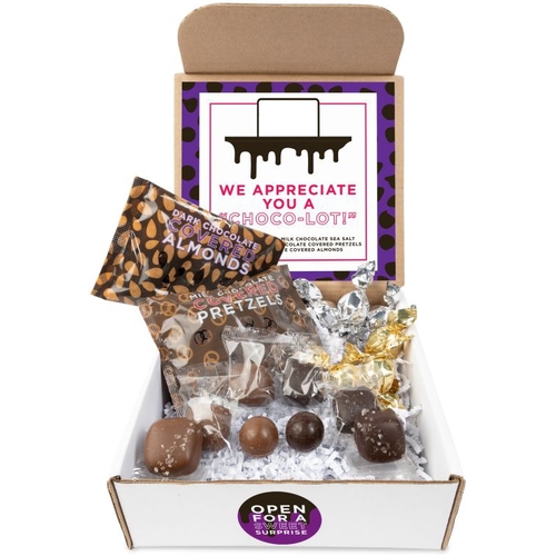 Top of mailer box exclaims "We Appreciate You a Choco-Lot." Outside sticker states "Open for A Sweet Surprise!"